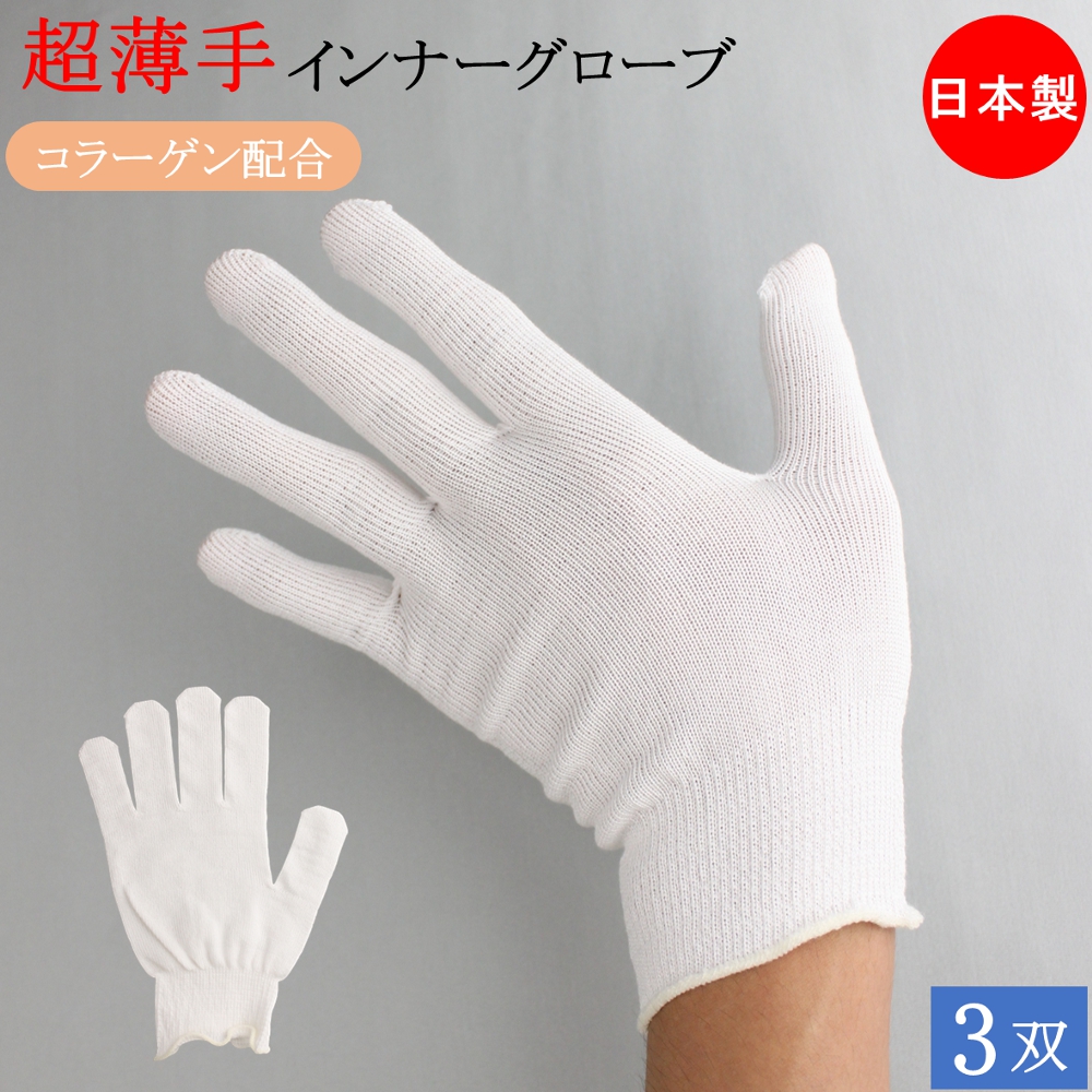 コラーゲン配合 FILAGEN インナー手袋 インナーグローブ 薄手 手袋 3双 フリーサイズ 日本製 コラーゲン 白 手荒れ 保湿 ハンドケア 男性用 女性用 おしゃれ