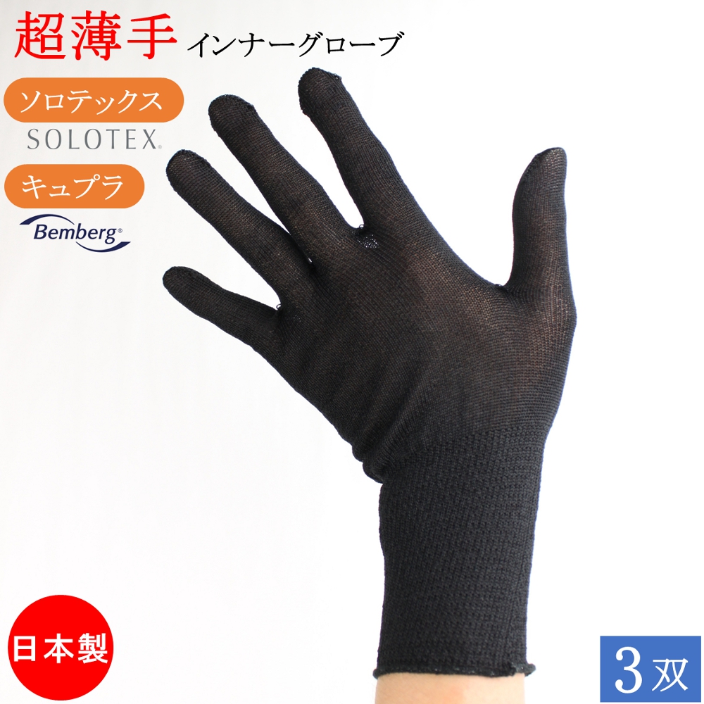 インナー手袋 ソロテックス キュプラインナーグローブ 薄手 ベンベルグ 手袋 3双 フリーサイズ 黒 手荒れ 歯科衛生士 介護 掃除 男性用 女性用 おしゃれ