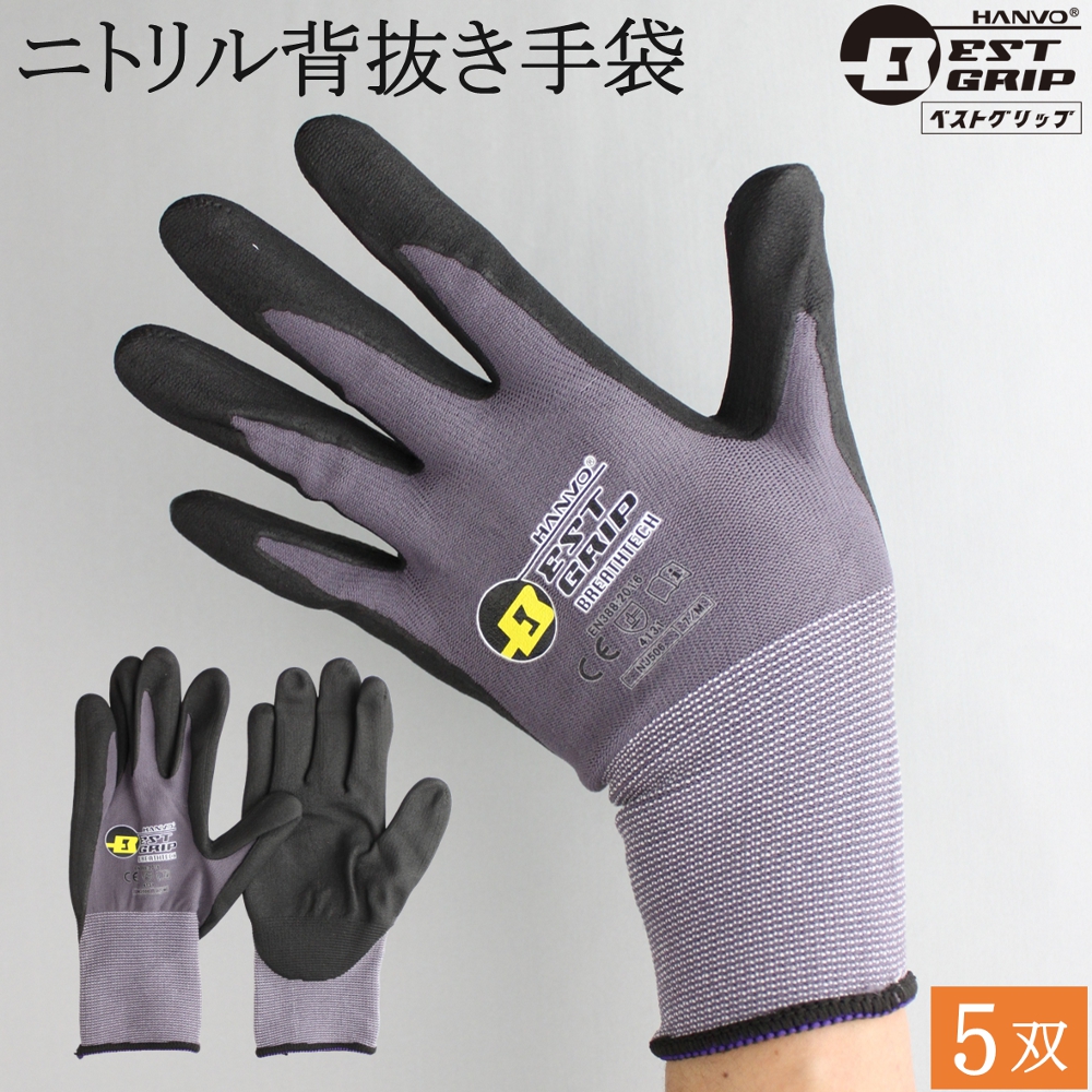 背抜手袋 作業用手袋 BEST GRIP ブレステック NJ506 5双 滑り止め 薄手 手袋 ベストグリップ ハンボ HANVO ニトリル 通気 蒸れない メンズ レディース おしゃれ