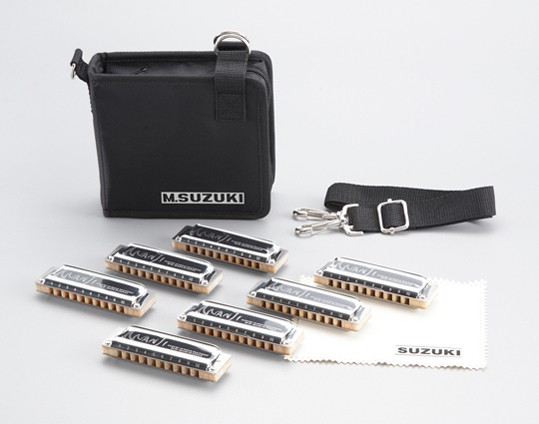 10穴ハーモニカ8本が入るソフトケース付き。