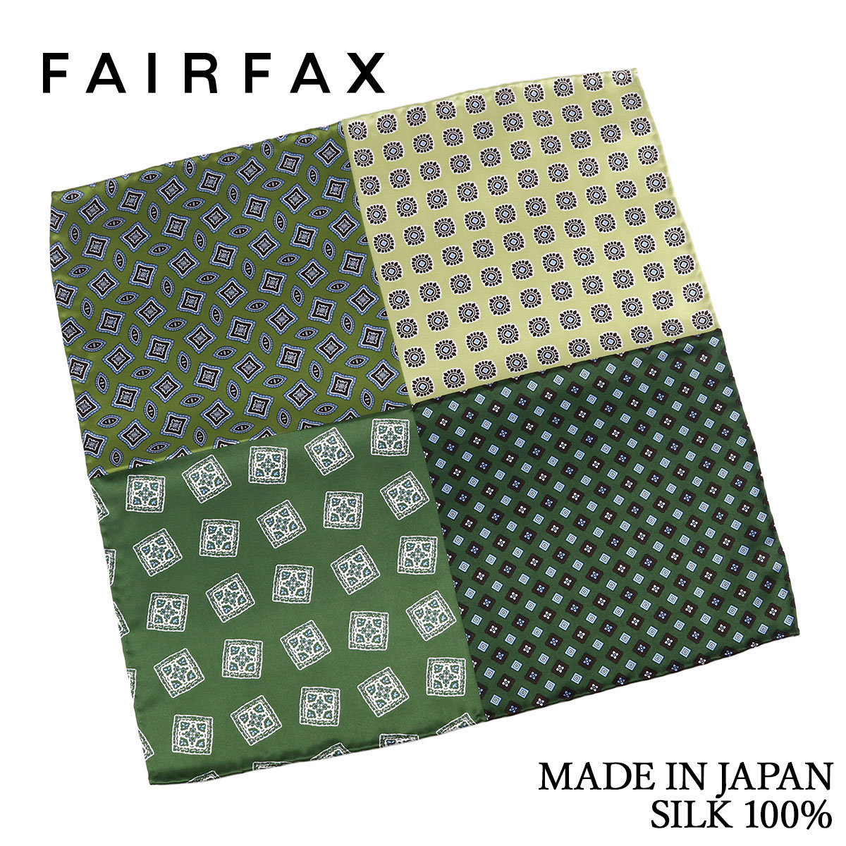 ポケットチーフ 結婚式 フェアファクス FAIRFAX シルク100% 4面 小紋 プリント グリーン 日本製 手縫い ハンドロール |バレンタイン プレゼント 祝い