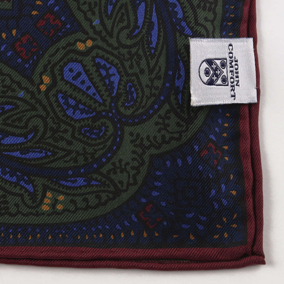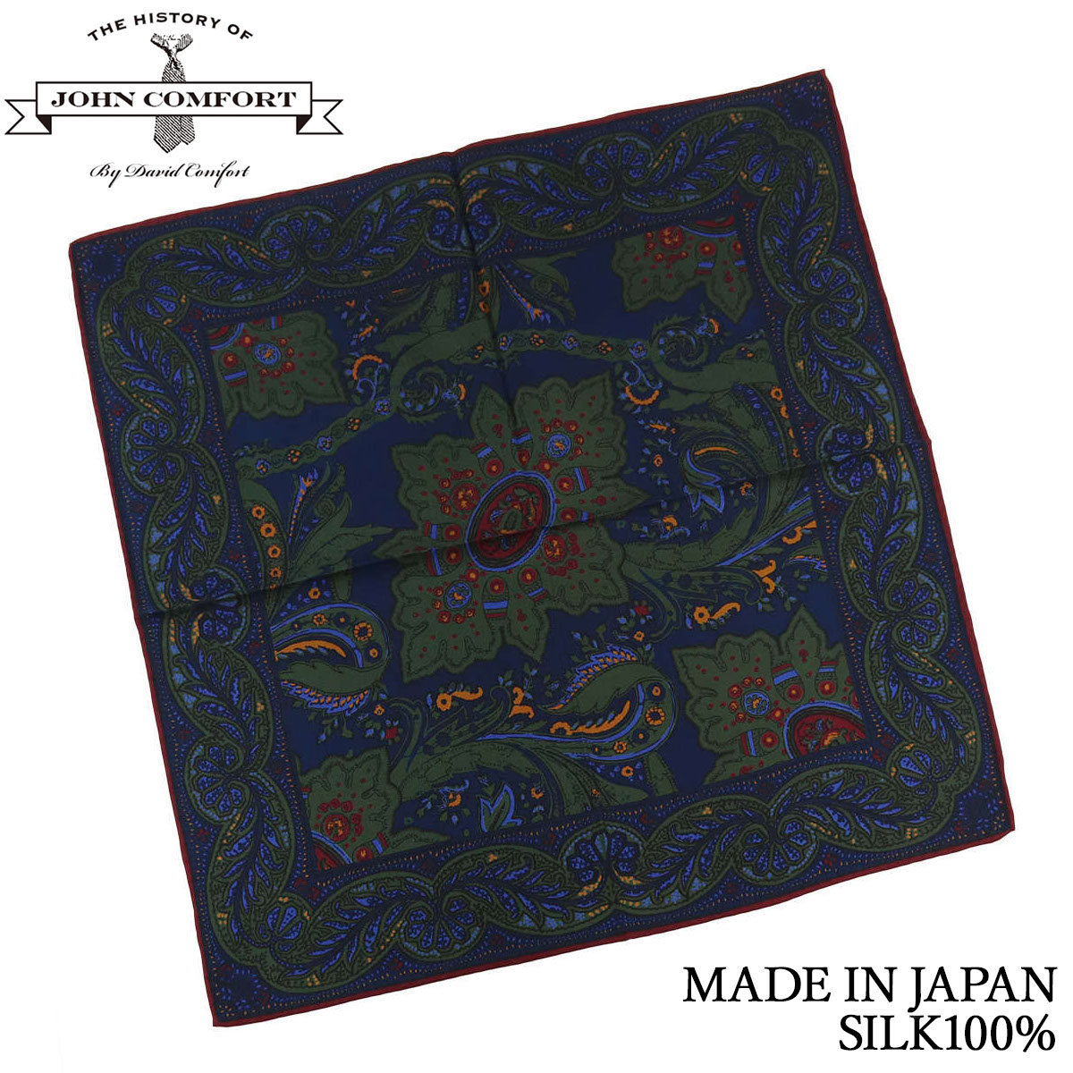 | 商品特徴 | 「レトロな総柄ペイズリープリント」 1908年創業の英国老舗ブランド JOHN COMFORT。 深みのある色合いと、繊細に表現されたレトロなペイズリー柄が、胸元に品格を添える大人の一枚です。 ポケットチーフの顔とも言える「縁」の仕上げは、日本の職人による手巻き縫製。 大量生産では生み出せない、柔らかな表情と“本物の風格”をお楽しみいただけます。 |