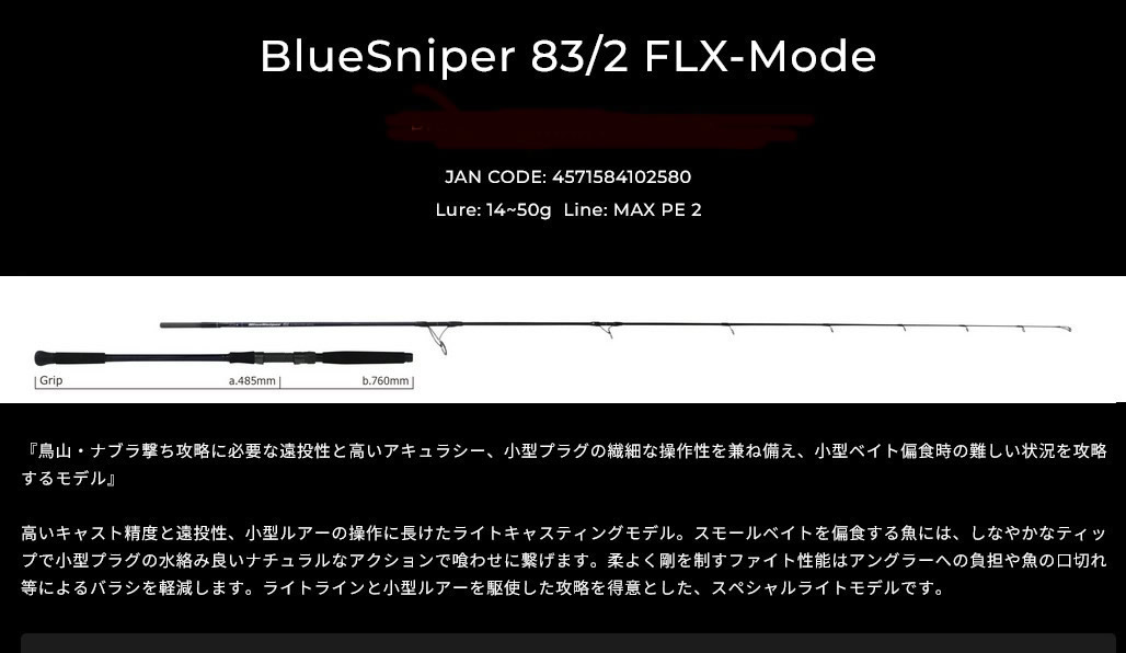 『鳥山・ナブラ撃ち攻略に必要な遠投性と高いアキュラシー、小型プラグの繊細な操作性を兼ね備え、小型ベイト偏食時の難しい状況を攻略するモデル』