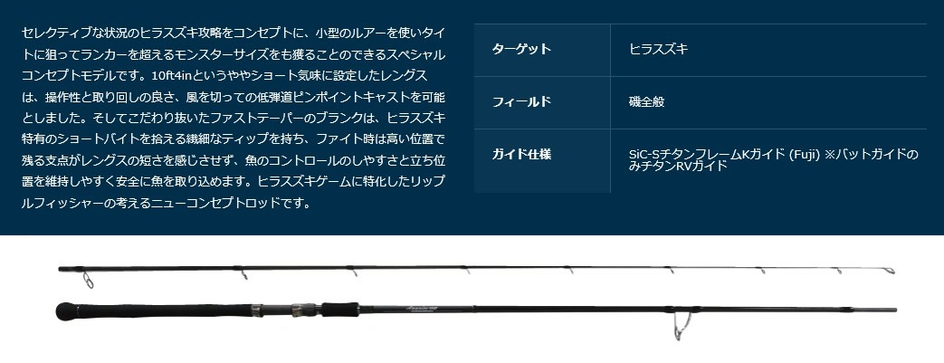 セレクティブな状況のヒラスズキ攻略をコンセプトに、小型のルアーを使いタイトに狙ってランカーを超えるモンスターサイズをも獲ることのできるスペシャルコンセプトモデルです。10ft4inというややショート気味に設定したレングスは、操作性と取り回しの良さ、風を切っての低弾道ピンポイントキャストを可能としました。そしてこだわり抜いたファストテーパーのブランクは、ヒラスズキ特有のショートバイトを拾える繊細なティップを持ち、ファイト時は高い位置で残る支点がレングスの短さを感じさせず、魚のコントロールのしやすさと立ち位置を維持しやすく安全に魚を取り込めます。ヒラスズキゲームに特化したリップルフィッシャーの考えるニューコンセプトロッドです。