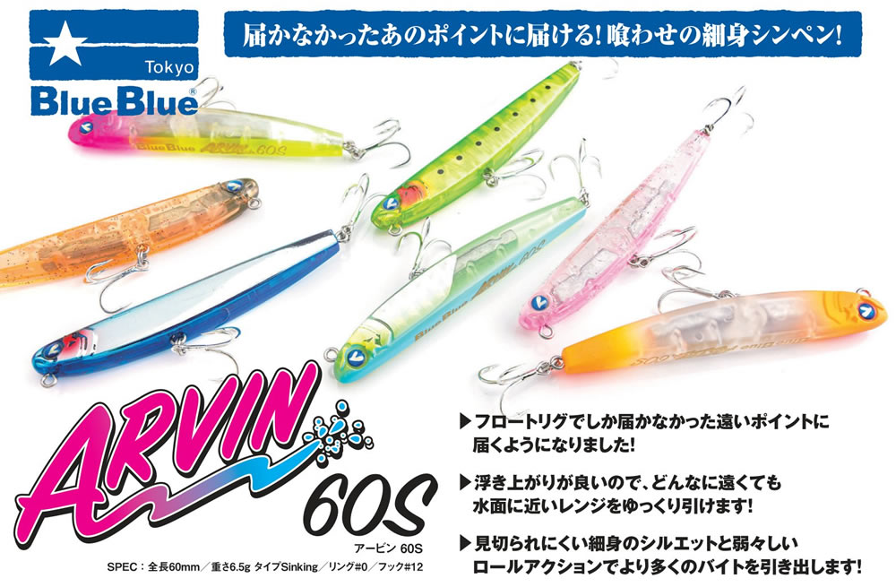 抜群の飛距離とバックスライド気味のシミーフォール、急速浮上とロール&フラッシング。遠距離アサルト系シンキングペンシル。堤防や磯、河川やサーフ。全てのシャローゲームと一部ボトムゲームに於いて、プラグ特有の存在感を確実に持ちながら、極限の『弱さ』に磨きを掛けたアービン60Sでライトゲームプラッギングの世界はまた一つ進化します。