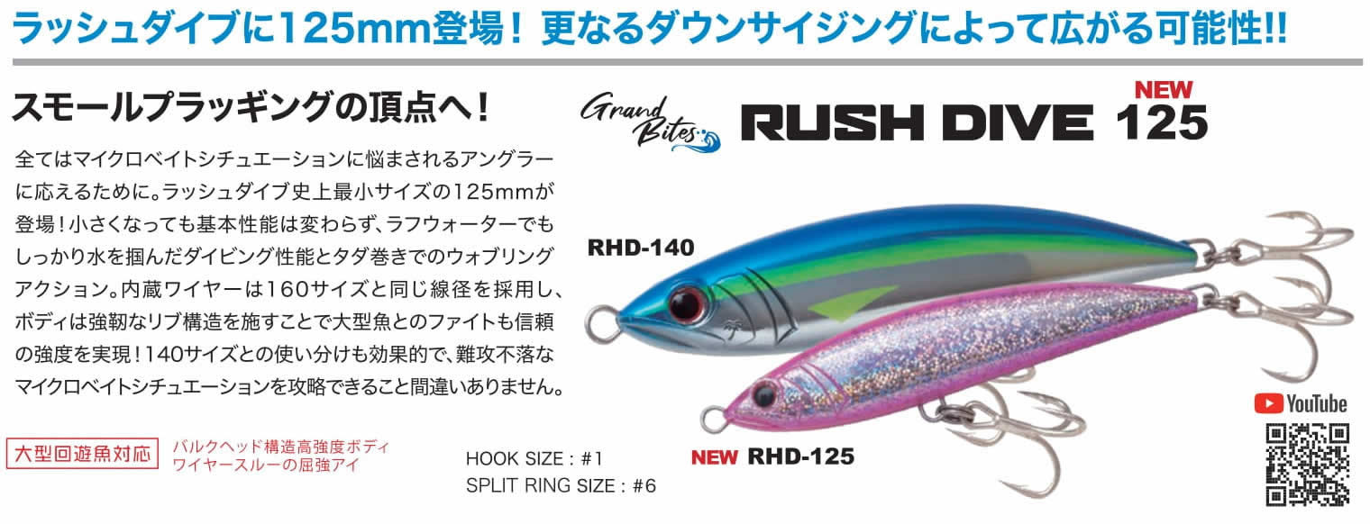 全てはマイクロベイトシチュエーションに悩まされるアングラーに応えるために。ラッシュダイブ史上最小サイズの125mmが登場!小さくなっても基本性能は変わらず、ラフウォーターでもしっかり水を掴んだダイビング性能とタダ巻きでのウォブリングアクション。内蔵ワイヤーは160サイズと同じ線径を採用し、ボディは強靭なリブ構造を施すことで大型魚とのファイトも信頼の強度を実現!140サイズとの使い分けも効果的で、難攻不落なマイクロベイトシチュエーションを攻略できること間違いありません。