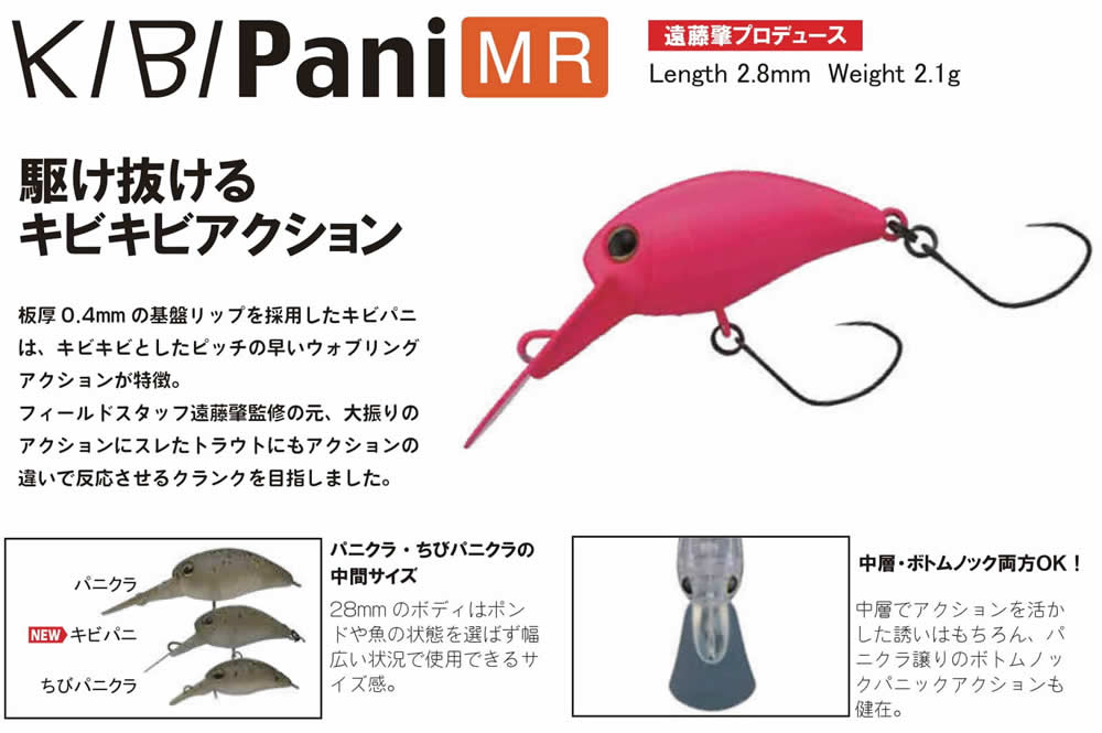 板厚0.4mmの基板リップを採用したキビパニは、キビキビとしたピッチの早いウォブリングアクションが特徴。フィールドスタッフ遠藤肇監修の元、大振りのアクションにスレたトラウトにもアクションの違いで反応させるクランクを目指しました。
