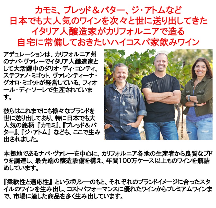 日本でも多くのレストランに採用されるカモミや、多くの消費者の方々に愛されているブレッド&バター、ジ アトム、イーター等、数々のワインを生み出してきたイタリア人醸造家が、ナパ ヴァレーに本拠地を置き生産しているハイコスパワインです。