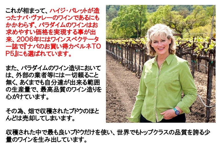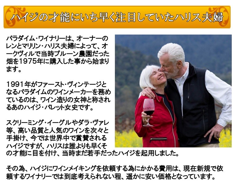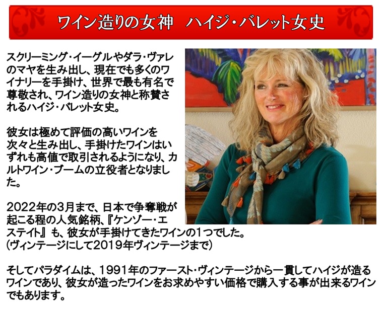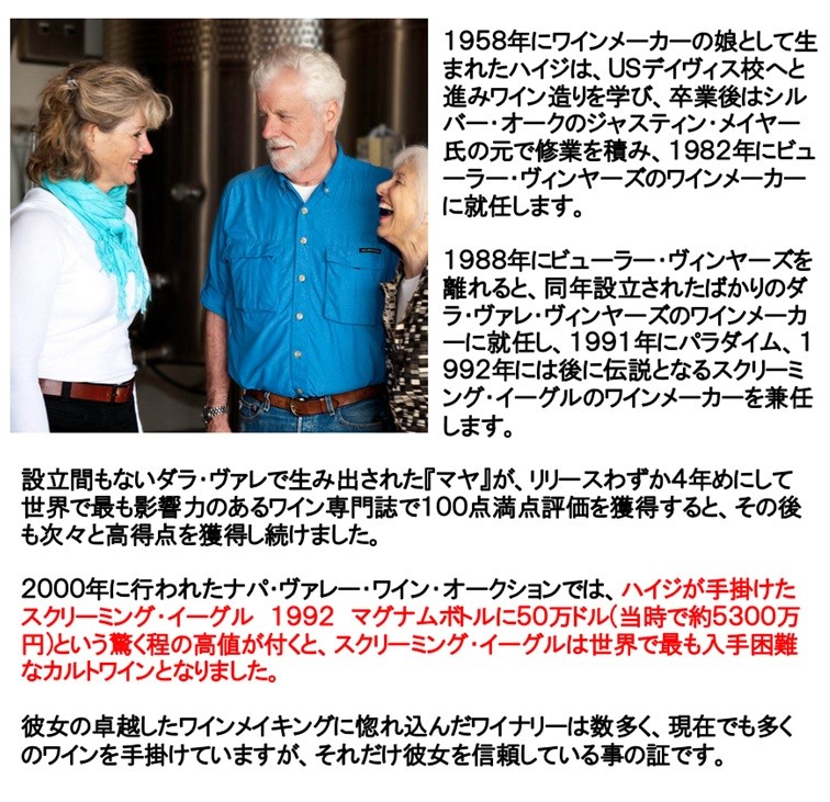何十万という高額で取引される幻のカルト、スクリーミング イーグルやダラ ヴァレのマヤを生み出し、日本でも大人気銘柄ケンゾー エステイトのワインを醸造していた、ハイジ バレットがオークヴィルで造るワインです。