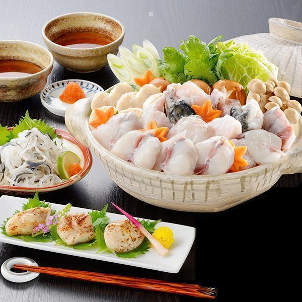 とらふぐぶつ切り400g(とらふぐ切身150g・アラ250g)、とらふぐ皮100g、とらふぐ焼き白子70g、ふぐちりスープ300g、とらふぐヒレ5枚、ふく醤油30ml×3、もみじおろし10g×3