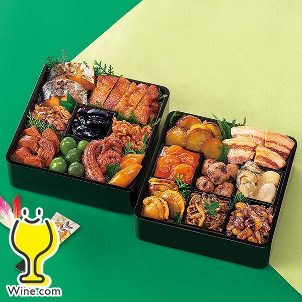 宝喜子、鰆の柚庵焼、たこのやわらか煮、とりつくね、焼ほたて、子持ちいかのうま煮、豚の角煮、くるみ艶煮、あさりのうま煮、若桃甘露煮、紫福豆(珈琲味)、さつまいも黄金煮(レモン煮)、海老チリソース煮、海老ピー、かきと里芋のクリーム煮、牛肉ときのこの赤ワイン煮