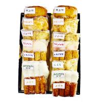 にら天3個×1、紅しょうが3個×2、ごぼう天3個×2、特上揚2個×2、あおさちぎり蒲鉾4個×2、上棒天4個×2、れんこん天2個×2、いわし棒天4個×2