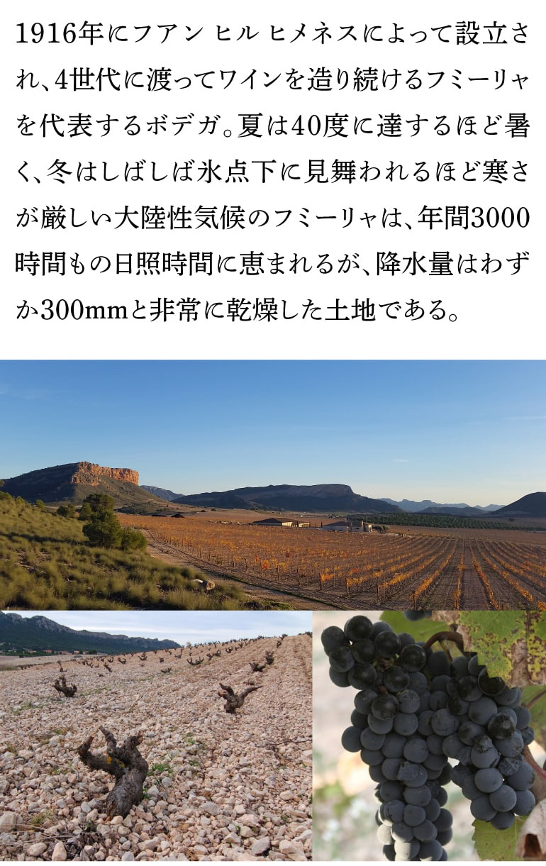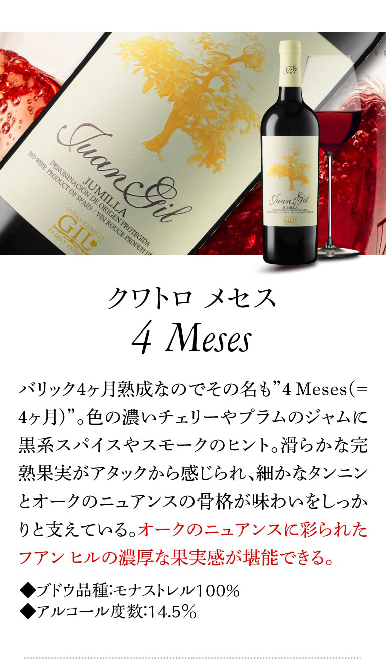 バリック4ヶ月熟成なので、その名も”4 Meses(=4ヶ月)”。シルバーラベルと同じ畑から造られたフアン・ヒルの新たなワインです。色の濃いチェリーやプラムのジャムに黒系スパイスやスモークのヒント。滑らかな完熟果実がアタックから感じられ、細かなタンニンとオークのニュアンスの骨格が味わいをしっかりと支えています。オークのニュアンスに彩られたフアンヒルの濃厚な果実感が堪能できます。