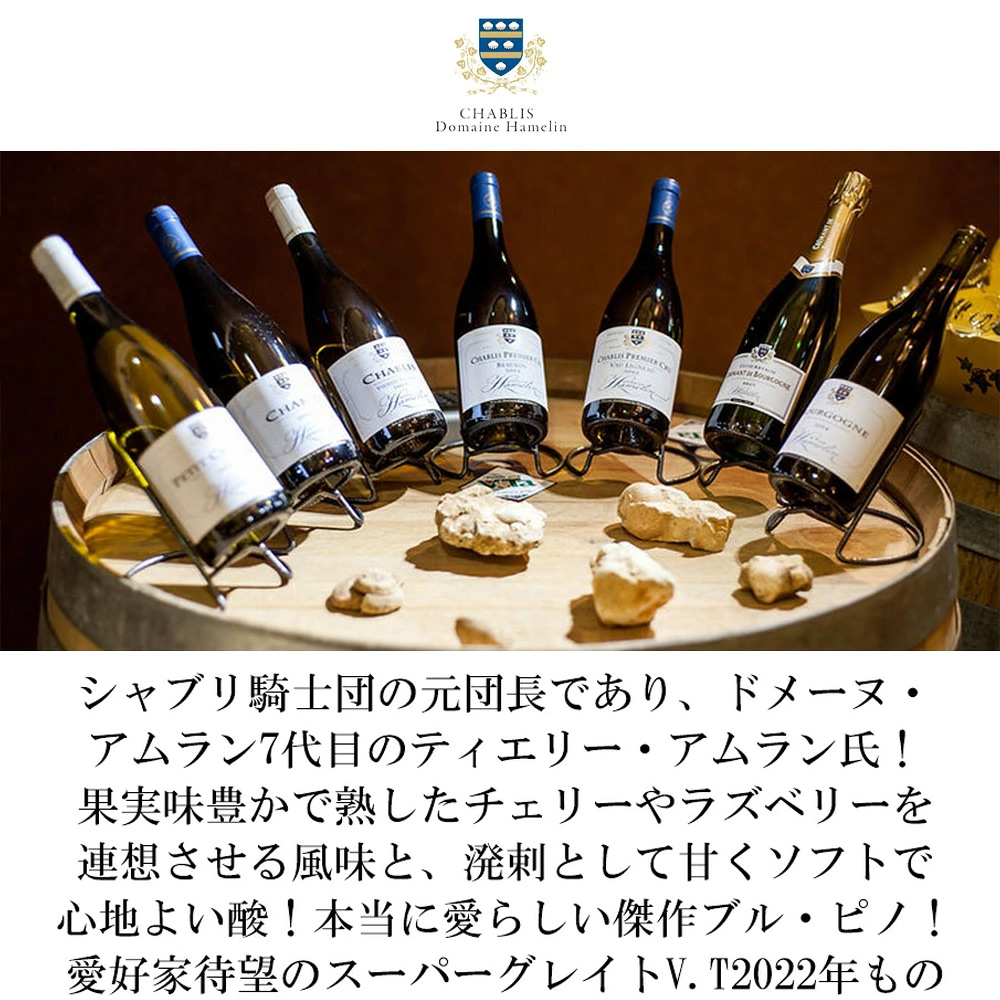 【商品説明】入手困難!ブルゴーニュ辛口赤ワイン愛好家大注目!ブルゴーニュ・ピノノワール種100%辛口赤ワイン愛好家大注目!しかもスーパーグレイトヴィンテージ[2022]年(アシェット・ガイド誌2024年版ではブルゴーニュの赤に「史上最高のヴィンテージのひとつ!驚異の18/20点(1970年以降、50年間で18/20以上は1971、1978、1990、2005、2015、2018、2019、2020年、2022年の過去に9ヴィンテージのみ。)」の最高評価でついに入荷!シャブリ地区で1840年から7世代の歴史ある名門ドメーヌ!(父から子へと6世代にわたってワイン造りを行ってきたアムランは、現在36.7ヘクタールのブドウ畑をポアンシー、ビーヌ、リニョレルの3つのコミューンに分けて栽培しており、石灰岩の下層土(キンメリジャン)が素晴らしいワインのフィネスとストラクチャーを与えている。)現当主は当店オーナーもメンバーである、ピエリ・シャブリジャン(シャブリ騎士団)の元団長であり、ドメーヌ・アムラン7代目のティエリー・アムラン氏!「テロワールの味わいをワインに残し、最大限の寛大さと魅力を提供するために、伝統と現代の技術を調和させることは、ティエリーとシャルル・ハメランにとって大きな関心事である。」ワインプレスの評価も高く、ロバート・パーカー氏をはじめゴーミヨ誌、ル・メイユール・ヴァン・ド・フランス(現クラスマン)、ワインスペクテーター誌、アシェト・ガイド誌(アシェットガイド誌2022年版ではプチ・シャブリがダブルスター星★★で掲載大注目!)等世界のワイン評論家&評価誌軒並み大注目の最強ドメーヌ!特にキンメリジャン土壌が厚い、ポワンシー村とベーヌ村とリニョーレル村にプティ・シャブリと村名シャブリとプルミエ畑の合計36.75haを所有!ずばりシャブリの西に位置するブルゴーニュ区画からの平均樹齢30年以上のピノ・ノワール100%をオーク樽熟成!「伝統的な手法と近代的な手法を上手く調和させ、フィルターを極力抑え、土壌の特徴やぶどうの持つポテンシャルをフルに発揮できるようにして、“常に満足のいくものを”」とその努力は惜しみなく造る究極ブルゴーニュ・ピノ・ノワール!リアルワインガイド誌64号でも2014年ものでさえ88点獲得!果実味豊かで熟したチェリーやラズベリーを連想させる風味と、溌剌として甘くソフトで心地よい酸!本当に愛らしい、偉大2022年ブル・ピノ!ミディアムボディ辛口赤ワイン!名門ドメーヌ・アムランの極旨ブル・ピノが大人気スーパーグレイトヴィンテージ[2022]年でしかもこのブルゴーニュワイン全体の価格高騰時良心価格でしかも蔵出し品で極少量入荷!