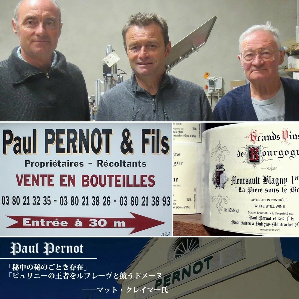 ポール・ペルノは1850年創業のピュリニー村を代表する造り手のひとつです。現在では創業者の孫とその息子達の手で運営。除草剤や化学肥料不使用。剪定は非常に細やか、剪定した若枝を粉砕して畑に撒き腐植質が送り込まれています。ポール・ペルノでは、テロワールとヴィンテージの持ち味を引き出すべく自然な手法が心がけられています。非常に細やかな配慮がなされ、品質に対するこだわりは徹底したものです。