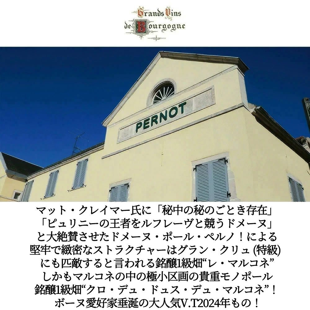 ドメーヌ・ポール・ペルノについてマットクレイマー氏は“ピュリニ・モンラッシェでは秘中の秘のごとき存在!ピュリニの王座をルフレーヴと競うドメーヌになるだろう”と大絶賛!「たぶん、ピュリニ=モンラッシェは秘中の秘のごとき存在ではなかろうか。そのワインは地元では秘密でもなんでもないどころか有名でさえある。しかしよそ者にはペルノは無名に等しく、それというのも全生産量の六ないし八割をジョセフ・ドルーアンに売ってしまうからだ。だが自前のブドウ畑は素晴らしく、腕前も見事である。フォラティエールには圧倒されるおもいがし、ピュセルとともに畑の最高作かと思う。ピュセルはビアンヴニュ=バタール=モンラッシェにつらなる区画をもつ。やがてワイン全て自家詰めする道を選ぶならば、ドメーヌ・ペルノこそはピュリニの王座をルフレーヴと競うドメーヌになるだろう。」【商品名】ボーヌ・“クロ・デュ・ドュス・デュ・マルコネ”・モノポール(単独所有畑)[2024]年・蔵出し限定品・ドメーヌ・ポール・ペルノー元詰・AOCボーヌ・プルミエ・クリュ