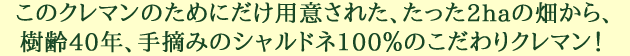 | ■ワインについて | 雑誌『一個人』や、ワイナート誌でも取り上げられたドメーヌのこだわりクレマン!100%このワインのために用意された、たった2haの畑から造られるクレマン!!シャルドネの平均樹齢は40年。 リュットレゾネの有機農法!収穫は全て手摘みにより、2日間で一気に行います。発泡にはシャンパーニュと同じく、メソッドトラディッショナル方式を採用しており、ドサージュ後9ヶ月間オリと共にねかせた後に、デゴルジュマンを行います。年間生産量12000本。究極のこだわり辛口スパークリングワインです! |
