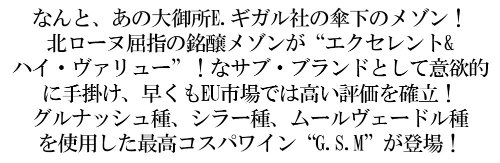 【ワインについて】フランス辛口赤ワイン愛好家大注目!南北で性格が大きく異なるフランスのコート・デュ・ローヌ地方!そのローヌ地方の最も北に位置し、ローヌワインで最も有名なコート・ロティの小さな村の中でブルーノ・ティエリーは造られています!なんと、あのE.ギガル社の傘下のメゾン!ずばり、北ローヌ屈指のメゾンが、“エクセレント&ハイ・ヴァリュー”なサブ・ブランドとして意欲的に手掛け、早くもEU市場では高い評価を確立しているワイン!“GSM”!ローヌ地方を代表する3品種から造られた、赤い果実やスパイスの香り、ふくよかな果実味が魅力のワイン!「 ブルーノ・ティエリーG.S.M」過去、リアルワインガイド誌で旨安賞!※以下「リアルワインガイド68号」より抜粋 「グルナッシュ、シラー、ムールヴェードルの頭文字をとって、G.S.M。その分かりやすさがまずイイ。程よい濃度の液体は滑らかで、スムースに流れていく。」 (今飲んで87+、ポテンシャル88) 注目!北ローヌ屈指のメゾンによるハイコスパ大人気辛口赤ワインが限定で少量入荷!