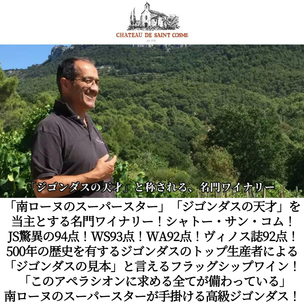 「南ローヌのスーパースター」「ジゴンダスの天才」を 当主とする名門ワイナリー!シャトー・サン・コム! JS驚異の94点!WS93点!WA92点!ヴィノス誌92点!500年の歴史を有するジゴンダスのトップ生産者による「ジゴンダスの見本」と言えるフラッグシップワイン! 「このアペラシオンに求める全てが備わっている」南ローヌのスーパースターが手掛ける高級ジゴンダス! ■さまざまなギフトアイテムをご用意しております。お中元 ギフト 御中元 お盆 お礼 敬老の日 クリスマス 冬ギフト お歳暮 御歳暮 お年賀 御年賀 お正月 年末年始 ご挨拶 バレンタイン ホワイトデー お返し 父の日 母の日 ギフト 贈答品 お土産 手土産 御祝 御礼 内祝い 引き出物 お祝い 結婚祝い 結婚内祝い 出産祝い 出産内祝い 引き菓子 快気祝い 快気内祝い 進学祝い 誕生日祝い バースデーケーキ プレゼント Wedding ウェディング ホームパーティ お花見 パーティ 退職ギフト 退職 就任祝い0105001009189