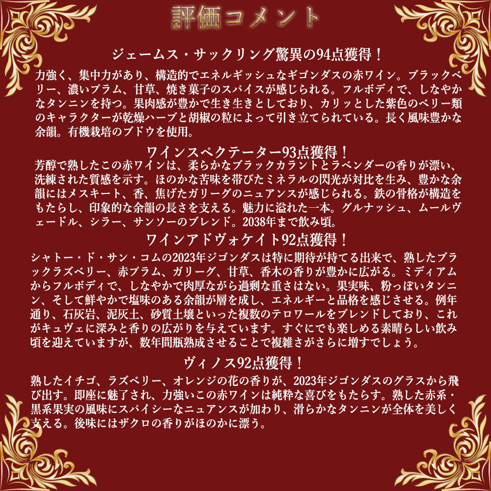 【商品名】ジゴンダス[2023]年・蔵出し品・シャトー・ド・サン・コム元詰・AOCジゴンダス・アルコール度数15%・ジェームス・サックリング驚異の94点&ワインスペクテーター93点&ワインアドヴォケイト92点&ヴィノス92点