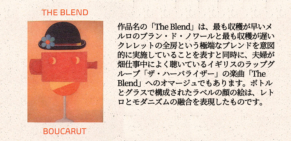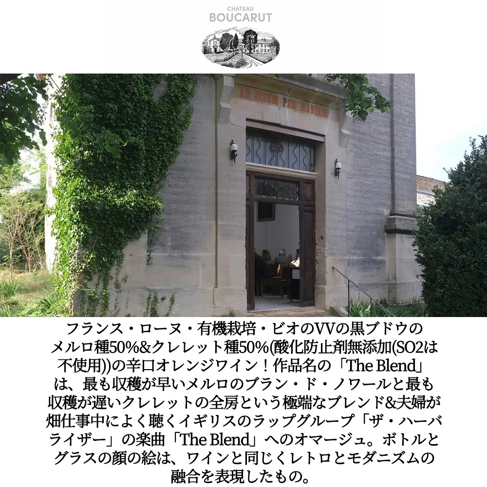 フランス・ローヌ・有機栽培・ビオのVVの黒ブドウのメルロ種50%&クレレット種50%(酸化防止剤無添加(SO2は不使用))の辛口オレンジワイン!作品名の「The Blend」は、最も収穫が早いメルロのブラン・ド・ノワールと最も収穫が遅いクレレットの全房という極端なブレンド&夫婦が畑仕事中によく聴くイギリスのラップグループ「ザ・ハーバライザー」の楽曲「The Blend」へのオマージュ。ボトルとグラスの顔の絵は、ワインと同じくレトロとモダニズムの融合を表現したもの。 ■さまざまなギフトアイテムをご用意しております。お中元 ギフト 御中元 お盆 お礼 敬老の日 クリスマス 冬ギフト お歳暮 御歳暮 お年賀 御年賀 お正月 年末年始 ご挨拶 バレンタイン ホワイトデー お返し 父の日 母の日 ギフト 贈答品 お土産 手土産 御祝 御礼 内祝い 引き出物 お祝い 結婚祝い 結婚内祝い 出産祝い 出産内祝い 引き菓子 快気祝い 快気内祝い 進学祝い 誕生日祝い バースデーケーキ プレゼント Wedding ウェディング ホームパーティ お花見 パーティ 退職ギフト 退職 就任祝い0105001009295
