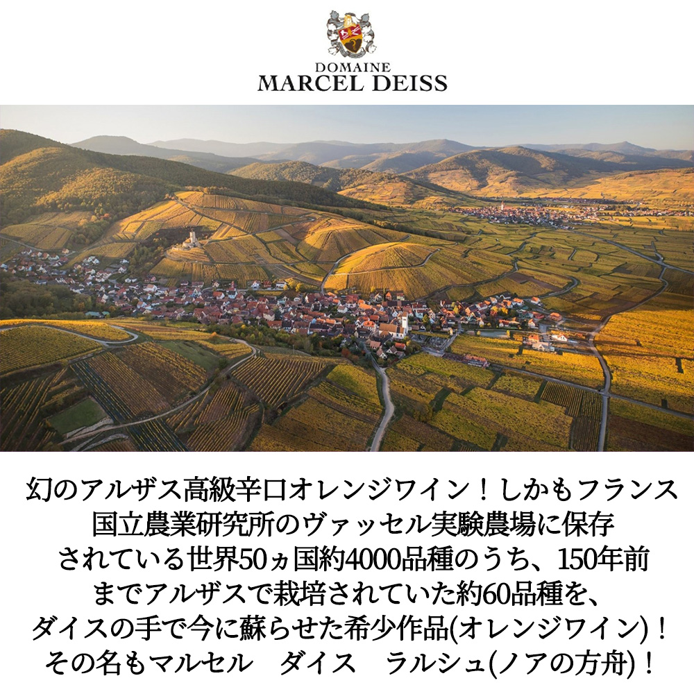 【商品名】マルセル ダイス ラルシュ(ノアの方舟) アルザス オレンジワイン NV 蔵出し超限定作品 ドメーヌ マルセル ダイス元詰 自然派【英名】Marcel Deiss L'Arche ALSACE OrangeWine NV VDF(Altenberg de Bergheim Grand Cru100%) Biodynamic【商品説明】入手困難!幻のアルザス高級辛口オレンジワイン!しかもフランス国立農業研究所のヴァッセル実験農場に保存されている世界50ヵ国約4000品種のうち、150年前までアルザスで栽培されていた約60品種を、ダイスの手で今に蘇らせた希少作品(オレンジワイン)です。しかもNV(現在販売中のものは2022年産50%、2023年産50%のブレンドで、2022年産はステンレスタンクで発酵、熟成。2023年産をステンレスタンクで発酵後、2022年産をブレンドして10ヶ月間熟成させました。)で超限定入荷!しかもアシェット・ガイド誌やベタンヌ&ドゥソーヴでも高評価!ロバート・パーカー満点★★★★★5つ星生産者であり(しかも“世界の最高級品と同等”のアルザス・ベストワインにマルセル・ダイスの5つのワインが選ばれています)!ゴーミヨ誌も5つ星を付け、クラスマンでは最高評価の★★★3つ星(トリプルスター・3つ星はマルセル・ダイスとヴァインバックとズィント・ウンブレヒトの3人だけ)クラスマンをして「敬意を表すべきドメーヌ…“忘我の境”があなたに訪れるだろう」と言わしめ大絶賛させたドメーヌ・マルセル・ダイスの超限定輸入品!このマルセル ダイス ラルシュ(ノアの方舟) アルザス・オレンジワイン NV・蔵出し限定品・ドメーヌ・マルセル・ダイス元詰・自然派・ビオディナミ・エコセール・AB公式認定・ヴァン・ド・フランスはフランス国立農業研究所のヴァッセル実験農場に保存されている世界50ヵ国約4000品種のうち、150年前までアルザスで栽培されていた約60品種を、ダイスの手で今に蘇らせた作品(オレンジワイン)です。Vin de France。グラン・クリュ・アルテンベルグ・ド・ベルグハイムに2012年に混植。0.3ha。収量は20hl/ha。現在販売中のものは2022年産50%、2023年産50%のブレンドで、2022年産はステンレスタンクで発酵、熟成。2023年産をステンレスタンクで発酵後、2022年産をブレンドして10ヶ月間熟成させました。無清澄・ノンフィルターでビン詰め。作品名の「ラルシュ」は「ノアの方舟」のことで、多種の動物を方舟に乗せて避難させたエピソードを、多種のぶどう品種の保存に重ね合わせたものです。究極ダイスのアルザス・グラン・クリュ・特級・アルテンベルグ・ド・ベルグハイム畑のわずか0.3haの畑からのVDFのオレンジワインが現地のセラー数ヶ月前の蔵出し作品で限定で極少量入荷!【タイプ】白・オレンジワイン 辛口【生産年】N.V【生産者】ドメーヌ・マルセル・ダイス (ジャン ミシェル ダイス氏)【生産地】フランス/アルザス/オレンジワイン ヴァンドフランス規格【内容量】750ml【JANコード】0108002006638