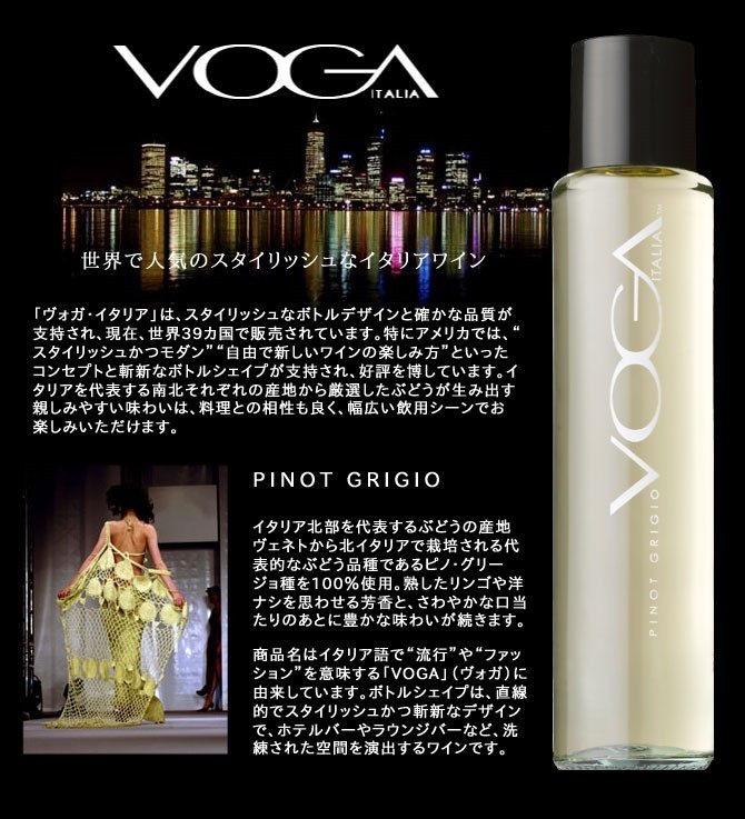 【ワインについて】「VOUGE」ついに日本上陸!斬新なボトルデザインと本格的なイタリアワインの味わいが支持され、ワイン大国アメリカで大成功!爆発大ヒット!のVOGA(ヴォガ)!(“流行”や“ファッション”を意味する英語の「VOUGE」!!と同じ)が日本初輸入!!もちろん味わいもイタリア北部を代表する産地ヴェネト州の、北イタリアを代表する白ぶどうピノ・グリージョ100%!熟した洋ナシやリンゴの芳香と、ジューシーで豊かな味わいの究極辛口白ワイン!が少量入荷!