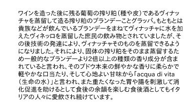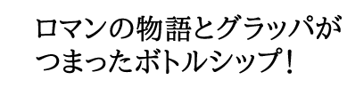グラッパファン必見!小さな帆船のボトルシップが入ったグラッパ!ワインを造った後に残るヴィナッチャ(搾り粕、種や皮)を蒸留して造られるグラッパ(搾り粕のブランデー)!元々は貴族などが飲んでいるブランデーを真似てヴィナッチャに水を加えたヴィネッロを蒸留した庶民の飲み物とされていましたが、固体の搾り粕をそのまま蒸留するため一般的なブランデーより2倍以上の種類の香り成分が含まれていると言われ、その葡萄本来の鮮やかな香りに柔らかで軽や