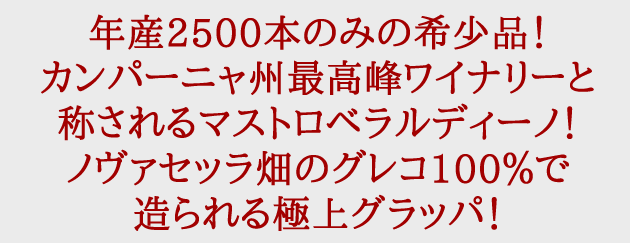 1878年創業。古い歴史を遡れば定かでないが、1700年代後半には自社瓶詰めをしていたワイナリー。昔はカンパーニャ州の大部分をマストロベラルディーノが所有していたという程の由緒のある名門。 第二次世界大戦終了後、9代目当主アントニオ・マストロベラルディーノ氏の尽力により、カンパーニャの地品種を使用した、テロワールを表現したワイン造りを行う。大戦の前後、世界中の消費者の嗜好がCS、メルローなどの国際品種傾向にあり、カンパーニャ中の生産者もグレコやアリアニコを次々と国際品種へ植え替えていった。戦争が終わった後、カンパーニャ特産のブドウ品種は激減しており、特にグレコなどはカンパーニャ全体での収穫量が僅か40kgのブドウという、絶滅寸前という状況になっていた。 | |