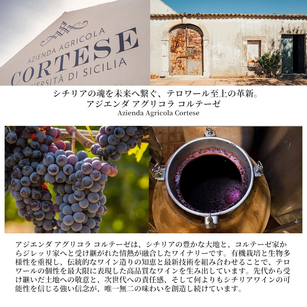コルテーゼのワイン造りは、個々の葡萄品種とテロワールの真の個性を最大限に引き出す哲学に基づいています。シチリアのワイン造りの歴史を尊重し、古代ギリシャ時代のアンフォラ発酵など伝統技術を積極的に採用。しかし、伝統に固執せず、最新技術も柔軟に組み合わせ、土地のあらゆるニュアンスを表現することを目指します。「テロワールとは、人々、環境、気候など、葡萄栽培とワイン造りに関わるすべて」という生産者の言葉通り、生物多様性を尊重し資源を大切にする姿勢は、ワインの品質に直結すると考えられています。伝統技術への深い理解と革新的な試みの融合が、コルテーゼならではの新しいスタイルのワインを生み出しているのです。