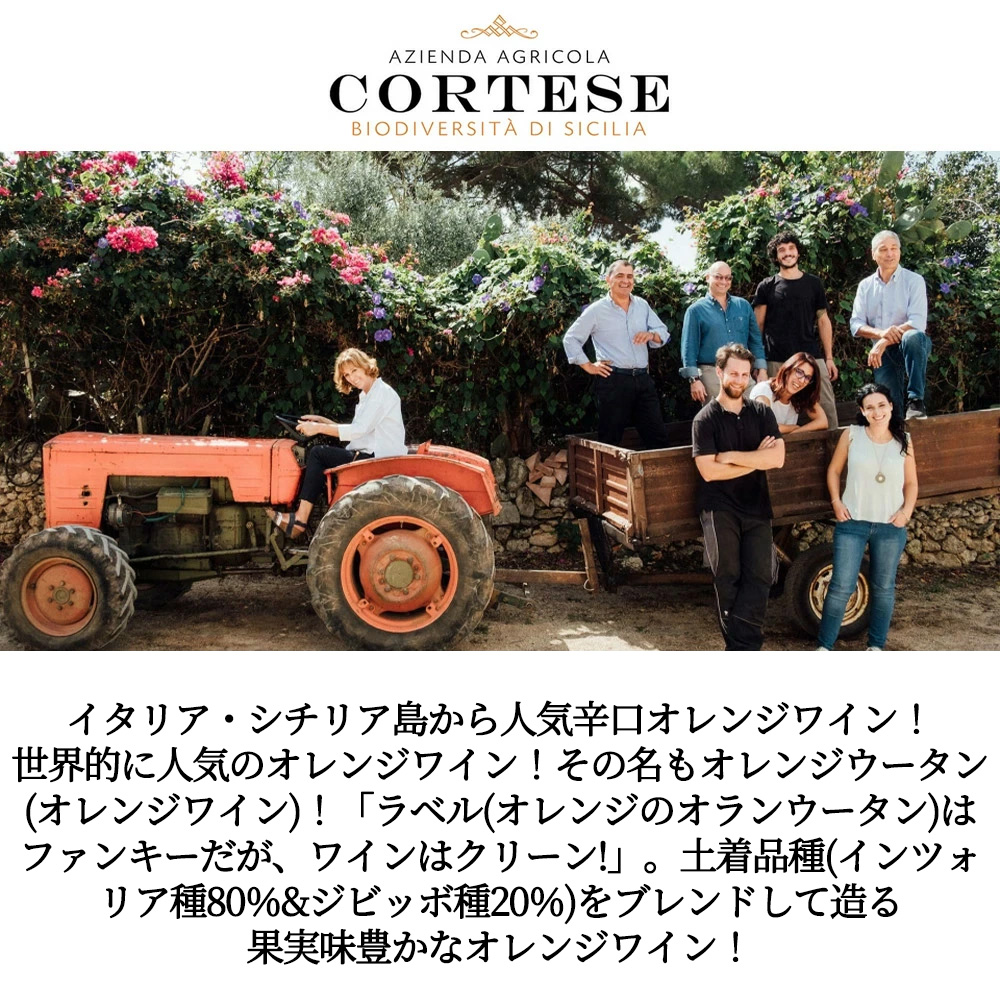 【商品名】オレンジウータン(オレンジワイン)[2024]年・アジエンダ・アグリコラ・コルテーゼ(3代目ステファーノ&マリーナ ジレッリ家)・IGPビアンコ・テッレ・シチリアーネ(オレンジワイン)・有機栽培・ビオロジック(ユーロリーフ認証&エコセール認証)&ヴィーガン・フレンドリー認証・(インツォリア種80%&ジビッボ種20%)・13%
