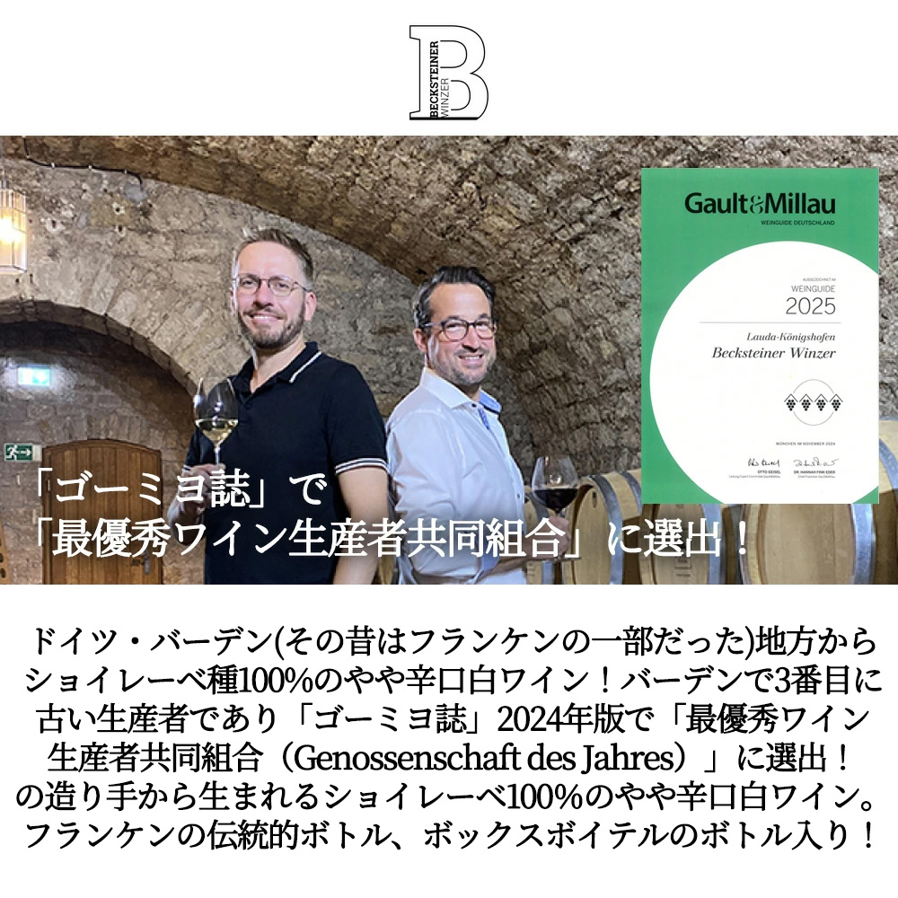 ベックシュタイナー・ヴィンツァーは、バーデン地方の最北となるタウバーフランケンに位置し、バーデンで3番目に古い生産者協同組合です。1894年8月31日にハインリッヒ・ハンスヤコブ博士と18人の熱意あるワイン生産者によってベックシュタイン村に設立されました。現在は354名の組合員が所属し、合計で276haの畑で栽培が行われています。 葡萄畑はベックシュタイン村を中心とする21の村々に広がっています。この地域は、冷涼な気候と貝殻石灰岩の土壌により、繊細でエレガントであると同時に親しみやすいスタイルのワインが生産されています。その安定した高い品質が認められ、「ゴ・エ・ミヨ」2024年版で「最優秀ワイン生産者協同組合(Genossenschaft des Jahres)」に選ばれています。さらに、「ゴ・エ・ミヨ 2025」では赤3房から4房に昇格しており、近年注目を浴びる生産者組合として高い評価を得ています。
