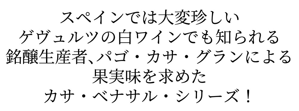 バレンシアでもこのワイナリーがある南部クラリアノは、最もよい地域とされています。恵まれたテロワールをいかし、ブドウ畑では100%有機栽培を実践しています。スペインでは珍しいゲヴュルツトラミネールは祖父がドイツから持ち込んだものです。母の手によりワインとなりましたが、ワイナリー経営は一時中断。2004年に息子のカルロスが、母の想いを受け継いでワイン造りを再興しました。【商品名】カサ・ベナサル・ゲヴュルツトラミネール・モスカテル[2024]年・パゴ・カサ・グラン元詰・D.Oバレンシア・自然派ビオロジック(CAECV認証)