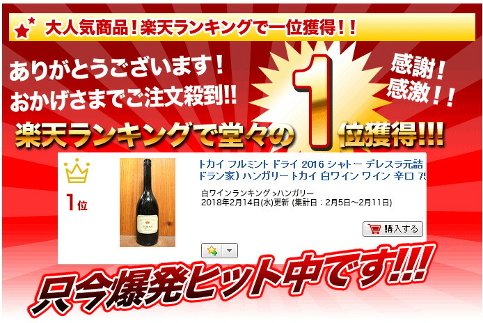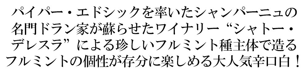 ハンガリー辛口白ワイン愛好家大注目!フルミント種ファン大注目!珍しいハンガリーのトカイのフルミント種主体!しかもフルミントの個性が存分に楽しめる大人気辛口白ワイン!ワイン雑誌“Wine Style”「査定価格の10倍のお手頃ワイン一挙紹介!」にて取り上げられた超ハイコスパワイン!芸人“髭男爵”のひぐち君(ワインエキスパート)セレクトにて「まるで白デニムのおしゃれマダム」と大注目!造り手は各国の王室ご用達!カンヌ映画公式認定のシャンパーニュで有名なパイパー・エドシックを率いたシャンパーニュの名門ドラン家が蘇らせたワイナリー“シャトー・デレスラ”!ワインスペクテーター誌ではトカイ・エッセンシアの'00で驚異の高得点をマーク!フルミント種85%にハールシュレヴェリュ15%で造られる残糖7.6g/Lの究極辛口白ワイン!このワインの2016VTでサクラワインアワード2019にて見事、金賞受賞!きらきらと輝く金色!メロンや白桃やレモンのフレーバーにやわらかな口当たり!きれいなミネラルとエレガントな酸を持ち、洋ナシ、リンゴや柑橘系のノートが舌の上で踊るようなフレッシュでフルーティーな味わい!また余韻のクリーミーさが特徴の辛口白ワイン!今、大注目のトカイ・フルミントが限定で少量入荷!