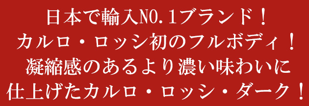 「カルロ ロッシ」の特長であるフルーティな味わいはそのままに、凝縮感のあるより濃い味わいに仕上げ、酸味をおさえました。日常的な食事との相性が良く、リラックスタイムなどにワインだけで楽しんでも飲み飽きない味わいで、同ブランド初のフルボディタイプです。パッケージは黒を基調にすることで、濃い味わいを表現しました。