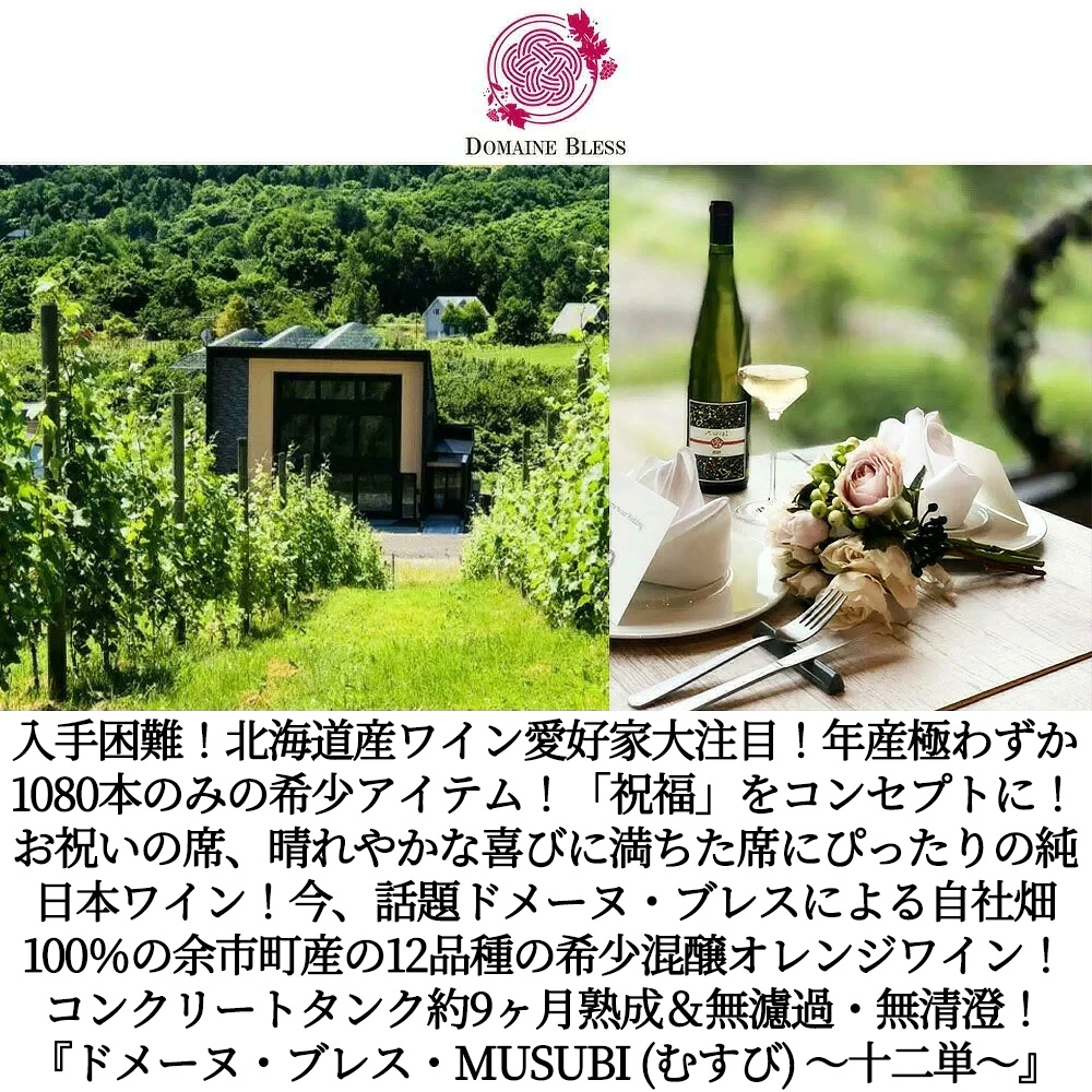 入手困難!北海道産ワイン愛好家大注目! 年産極わずか1080本のみの希少アイテム!「祝福」をコンセプトに!お祝いの席、晴れやかな喜びに満ちた席にぴったりの純日本ワイン!今、話題ドメーヌ・ブレスによる自社畑100%の余市町産の12品種の希少混醸オレンジワイン!コンクリートタンク約9ヶ月熟成&無濾過・無清澄!『ドメーヌ・ブレス・MUSUBI (むすび) ?十二単?』 ■さまざまなギフトアイテムをご用意しております。お中元 ギフト 御中元 お盆 お礼 敬老の日 クリスマス 冬ギフト お歳暮 御歳暮 お年賀 御年賀 お正月 年末年始 ご挨拶 バレンタイン ホワイトデー お返し 父の日 母の日 ギフト 贈答品 お土産 手土産 御祝 御礼 内祝い 引き出物 お祝い 結婚祝い 結婚内祝い 出産祝い 出産内祝い 引き菓子 快気祝い 快気内祝い 進学祝い 誕生日祝い バースデーケーキ プレゼント Wedding ウェディング ホームパーティ お花見 パーティ 退職ギフト 退職 就任祝い1900004005997