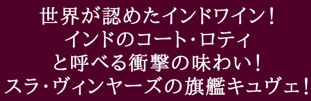 21世紀の大国、インドの衝撃!!今、世界のワインのプロを虜にする史上最高のインドワイン!インド最高峰のワイナリーが世界のワイン・マニアに真価を問う衝撃のワインがついに日本上陸!!<インドのコート・ロティ>と呼べる衝撃の味わい!スラ・ヴィンヤーズの旗艦キュヴェ!100%バリック(新樽比率40%)で熟成! 究極赤ワインがついに入荷!!