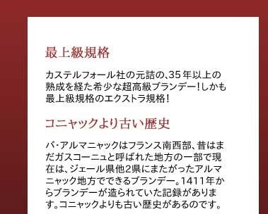 カステルフォール社の元詰の、38年以上の熟成を経た希少な超高級ブランデー!しかも最上級規格のエクストラ規格!バ・アルマニャックはフランス南西部、昔はまだガスコーニュと呼ばれた地方の一部で現在は、ジェール県他2県にまたがったアルマニャック地方でできるブランデー。1411年からブランデーが造られていた記録があります。コニャックよりも古い歴史があるのです。中でもこのバ・アルマニャックが一番高級ではっきり言ってアルマニャックの前に「バ」があるとないとでは大違いなのです。バ・アルマニャックは粘土と砂土の多い比較的平坦な土地。ここで造られるブランデーはプラムを思わせる香りを持ち、繊細で最も洗練されていると言われています。1976年(昭和51年)生まれの方へのバースデープレゼントに!38周年の記念ボトルにも最適です!