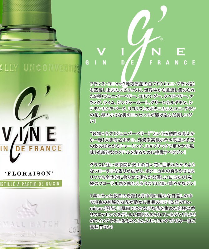 フランス・コニャック地方原産の白ブドウ(ユニ・ブラン種)を蒸留し出来たスピリッツにジュニパーベリー、コリアンダー、クベドベリー、ナツメグ、ライム、ジンジャールート、グリーンカルダモン、シナモンカシアバータ、リコリスの9種のボタニカルとユニ・ブランの花、緑の小さな実のエッセンスが溶け込んだ美しいジン!穀物+ネズという伝統的な考えから一転!大手有名ホテル、外資系高級ホテル取扱い多数!飲めばわかるチャーミング、エキゾチックで華やかな風味!革新的なカクテルを創るために挑戦すべきジン!グラスに注いだ瞬間に沢山の白い花に囲まれたかのようなフローラルな香りが広がり、ボタニカルの爽やかさもありつつも全体的に柔らかで滑らかな優しい口当たり!究極のフローラル感を味わえる今までに無い華やかなジン!仏語でFloraison(開花)!!繊細ではかなげな花を集めた究極の香りのエッセンスをボトルに閉じ込められているジン!大ぶりのワイングラスに氷をたくさん入れてロックで!ぜひ一度ご賞味下さい!