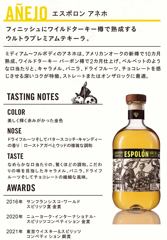 【商品名】【正規品】エスポロン アネホ プレミアム テキーラ 750ml 40%【英名】ESPOLON ANEJO PREMIUM TEQUILA 750ml 40%【商品説明】メキシコ ハリスコ州のサン・ニコラス蒸溜所で誕生し、 マスターディスティラー、チリロ・オロペーザが奏でる プレミアムテキーラ!!エスポロン!!ハリスコ州ロスアルトス地区の地下250mから汲み上げたミネラル豊富な水はエスポロンの唯一無二のフレーバーを生み出しています!!エスポロンはブルーアガベ100%使用!!マスターディスティラーであるチリロ・オロペーザは化学工学のバックグラウンドと50年以上の蒸溜経験を活かし、唯一無二のプレミアムテキーラ!!エスポロンを誕生!!最高のテキーラを生み出す事は、チリロにとって生涯の夢であり、革新的な精神、細部へのこだわり、型にはまらないメソッドによってそれを実現させる事に成功しました!!エスポロンのユニークなパッケージは、伝説的なアーティスト、ホセ・ グアダルーペ・ポサダに敬意を表して描かれており、メキシコでは死と生まれ変わりの象徴であるカラベラ(スカル)と国民の誇りを象徴する雄鶏をモチーフにしたデザインで表現されています!!そんなエスポロンのフィニッシュにワイルドターキー樽で熟成するウルトラプレミアムテキーラ!!エスポロン アネホ!!ミディアム〜フルボディのアネホは、アメリカンオークの新樽で10カ月熟成、ワイルドターキー バーボン樽で2カ月仕上げ!!ベルベットのような口当たりと、キャラメル、バニラ、ドライフルーツ、チョコレートを感じさせる深いコクが特徴!!ストレートまたはオンザロックに最適な逸品!!【生産者】サンニコラス蒸溜所【生産地】メキシコ ハリスコ州【内容量】750ml【JANコード】9903000026548