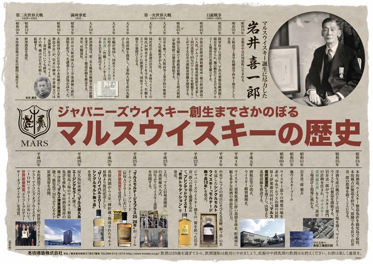 日本で蒸留された初めてのジャパニーズウイスキーは昭和4年(1929)に誕生しました。その20年後、戦後間もない昭和24年(1949)にマルスウイスキーの歴史は始まります。 高度経済成長期の昭和30年-40年代には、仕事帰りに立ち寄って気軽にウイスキーを飲めるスタンドバーが流行するなど、日本でもウイスキーが定着しはじめ、やがて日本各地で独自のウイスキー造りをはじめるという「地ウイスキー」ブームが起こります。 製造規模が小さく、少量ながらも地道に個性豊かな地ウイスキー造りに努め、大手メーカーに負けず劣らないウイスキーをめざし、80年代の地ウイスキーブームの火付け役とも言われました。