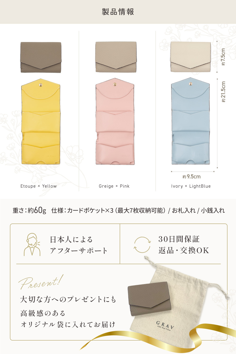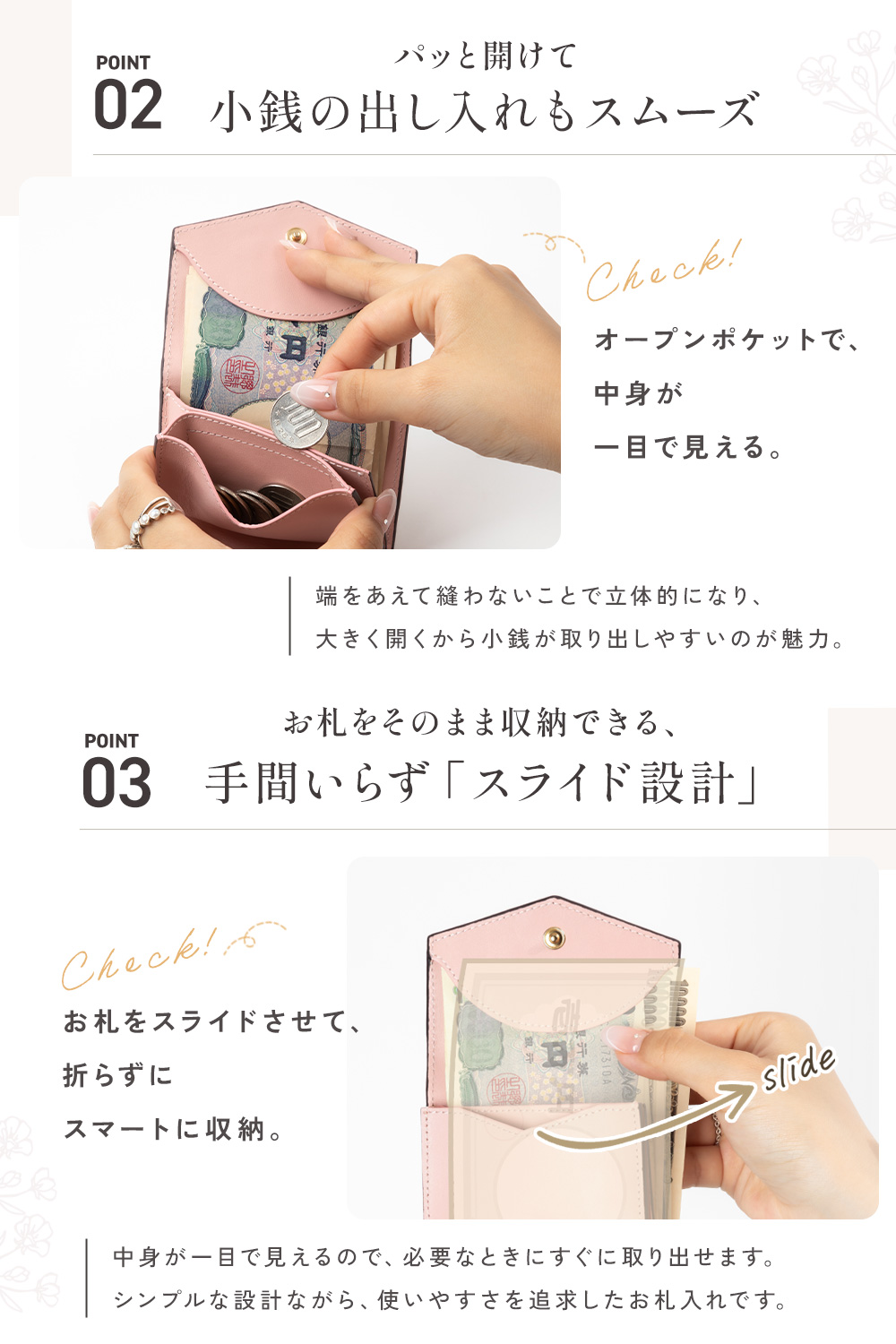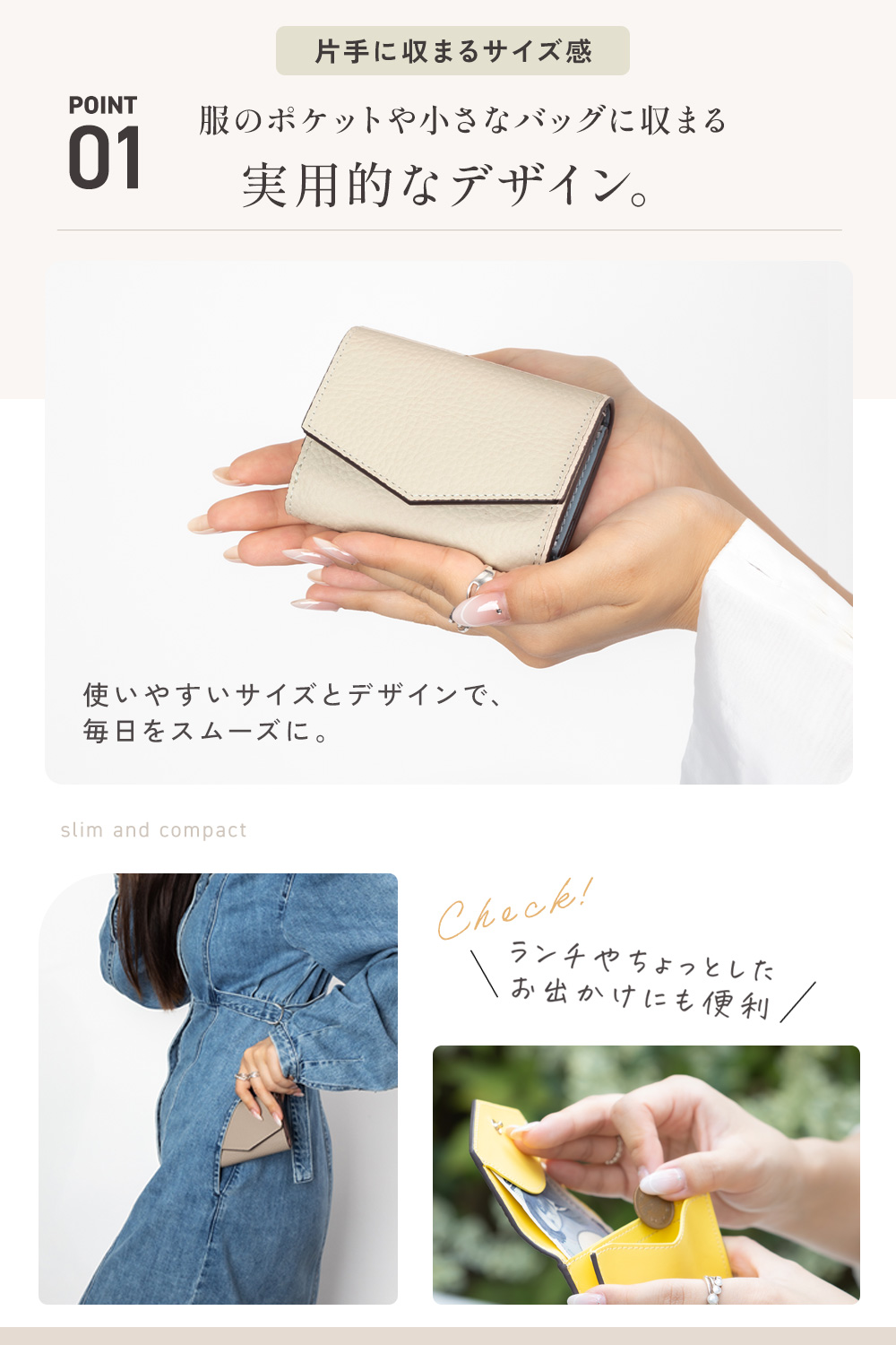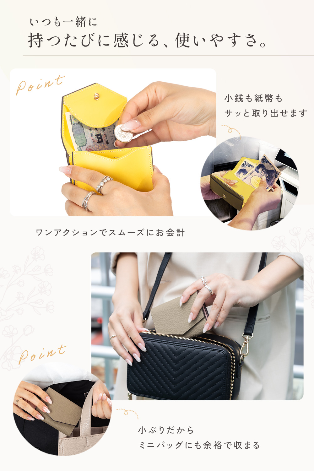 | POINT ・手に馴染むコンパクト感 ・お札を折らずに綺麗に収納 ・パッと取り出せる小銭入れ ・おしゃれで洗練されたバイカラー こんな方におすすめ ・キャッシュレス派だけど現金も持ち歩きたい ・ミニバッグでもかさばらない財布がほしい方 ・バイカラーでおしゃれな財布を探している方 小さいのに機能が充実。日常で頼りになる設計! 色のコントラストが生み出す印象的な美しさ♪ |