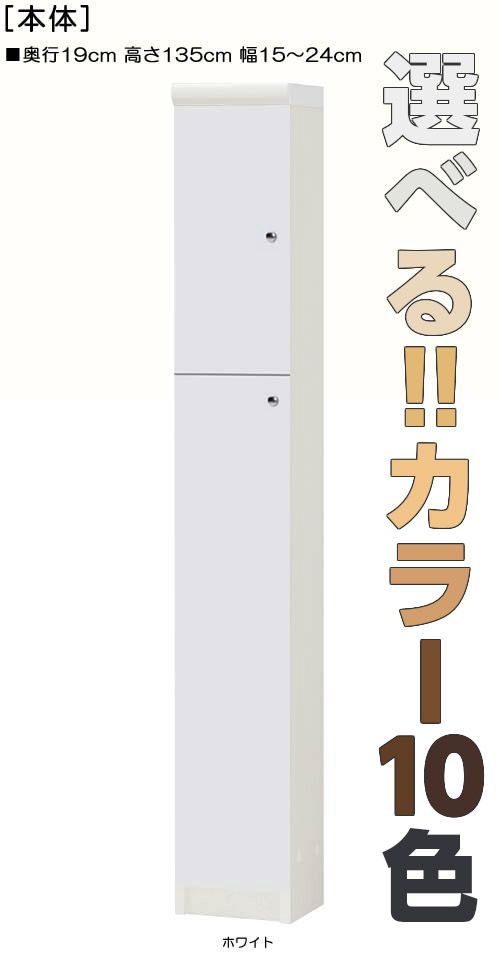 | 全面扉 | 標準棚板(厚さ1.7cm) | 棚板耐荷重:9Kg | 奥行19cm | 高さ135cm | 幅15〜24cm | お客様組立て | 低ホルムアルデヒド |