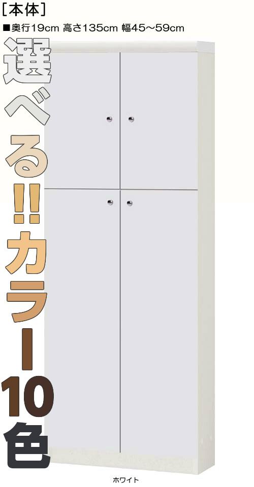 | 全面扉 | 標準棚板(厚さ1.7cm) | 棚板耐荷重:4Kg | 奥行19cm | 高さ135cm | 幅45〜59cm | お客様組立て | 低ホルムアルデヒド |