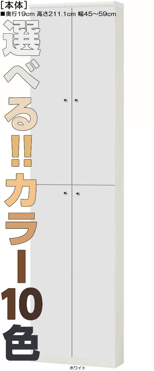 | 全面扉 | 標準棚板(厚さ1.7cm) | 棚板耐荷重:4Kg | 奥行19cm | 高さ211.1cm | 幅45〜59cm | お客様組立て | 低ホルムアルデヒド |