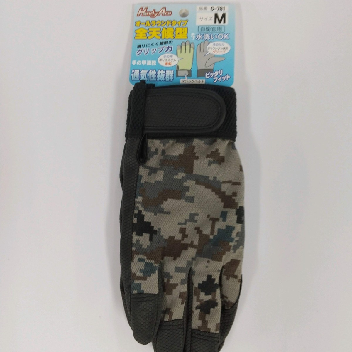 空自デジ迷彩 グローブ手袋 オールラウンドタイプ サイズM です。/材質 合成皮革 手の甲 ポリエステル/航空自衛隊 デジタル迷彩グローブ/オールラウンドタイプ 全天候型※男女兼用ジャストフィット/水洗いOK!(手の甲速乾)・他のサイズもあります。
