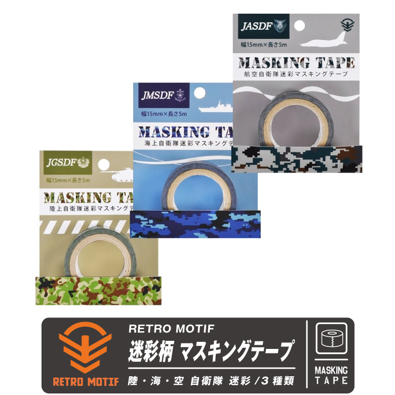 RETRO MOTIF 陸・海・空 自衛隊 迷彩柄 マスキングテープ 陸上自衛隊 海上自衛隊 航空自衛隊 迷彩 カモ テープ ミリタリー 文房具 サバゲー グッズ アイテム