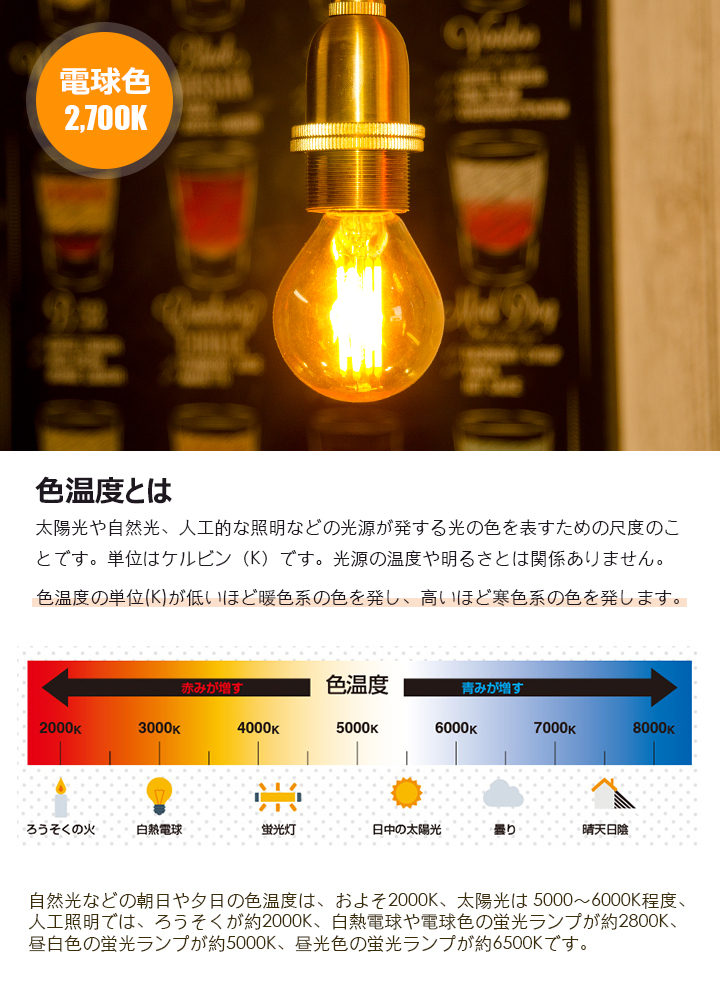 自然光などの朝日や夕日の色温度は、およそ2000K、太陽光は 5000〜6000K程度、 人工照明では、ろうそくが約2000K、白熱電球や電球色の蛍光ランプが約2800K、昼白色の蛍光ランプが約5000K、昼光色の蛍光ランプが約6500Kです。