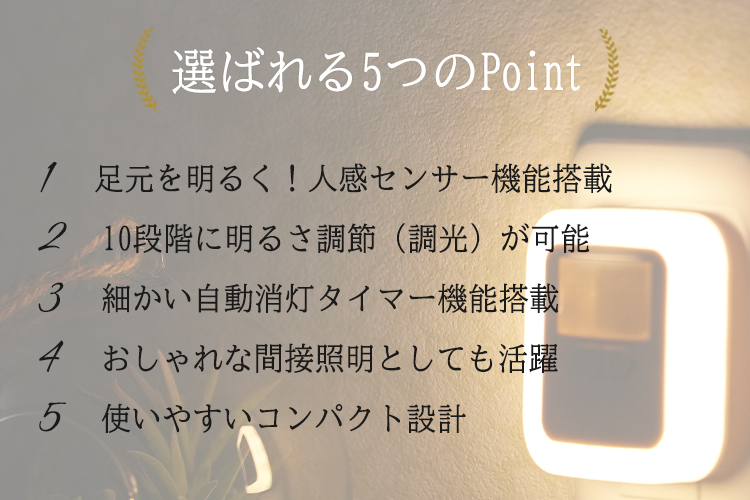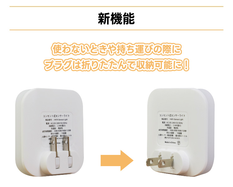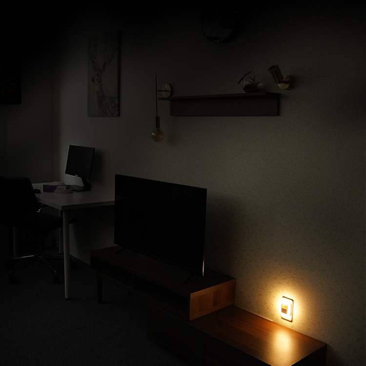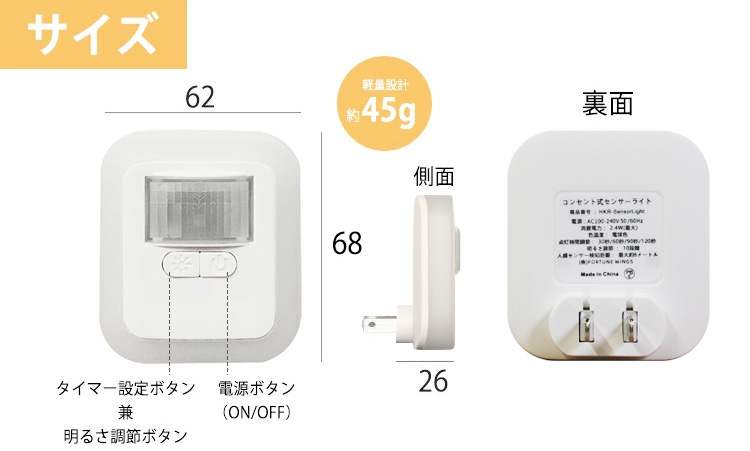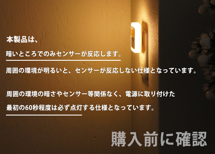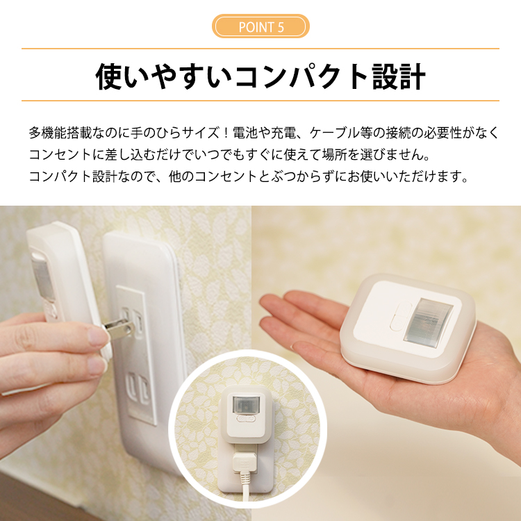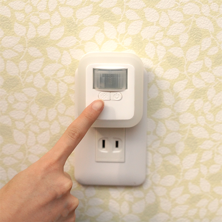 コンセントから電源を取るタイプで、暗い時に人が近づくたびライトが点灯します。