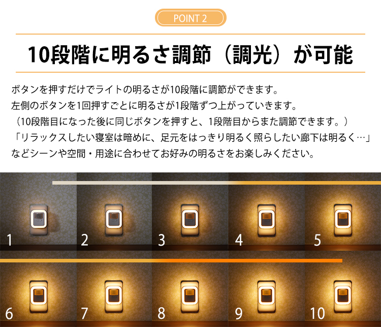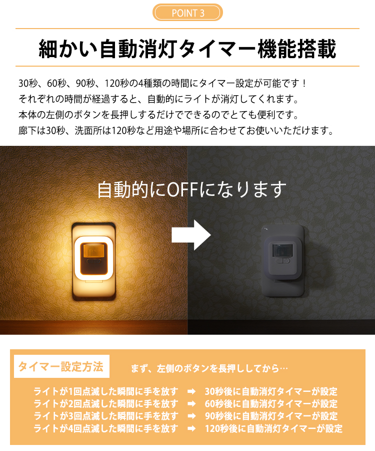 手のひらサイズに加えて、明るさは10段階から、点灯時間は30秒から120秒の間の4パターンから設定可能なため、用途や場所に合わせて臨機応変に対応可能です。